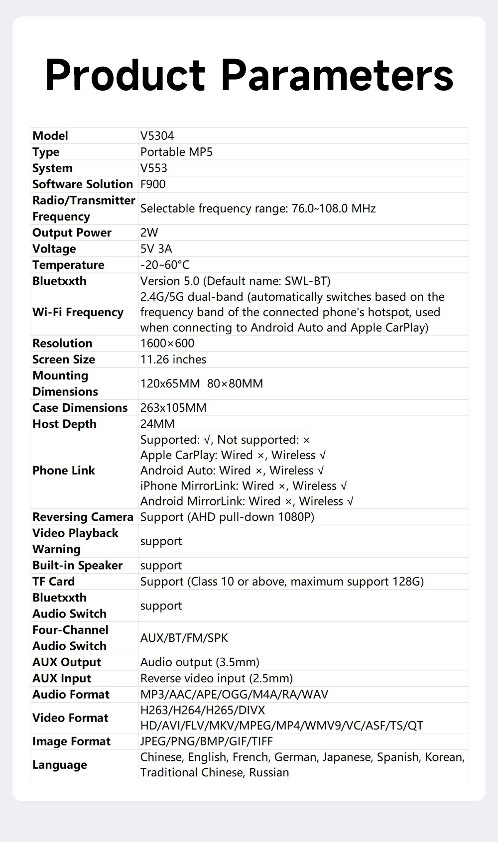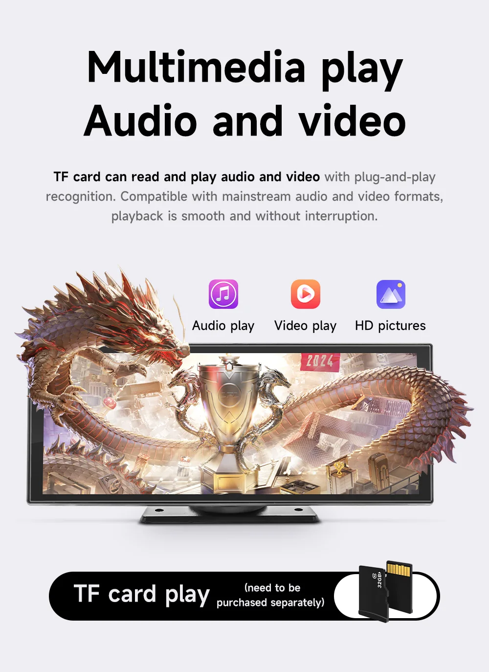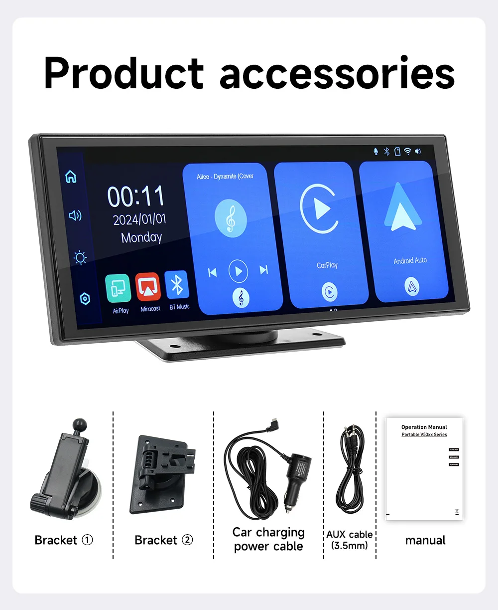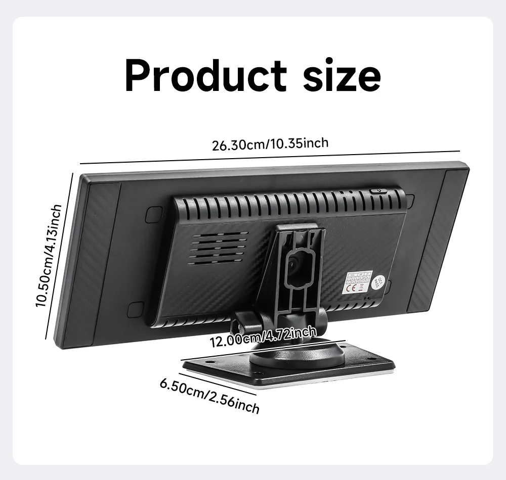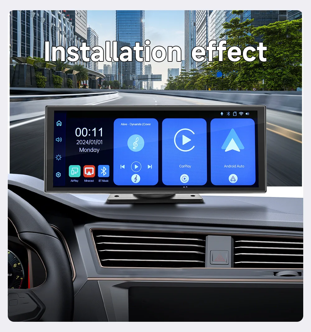 [How to Get Car Audio Sound] This 11.26-inch CarPlay car screen has built-in speakers, but if you want louder sound, you can transmit its sound to your car speakers in three ways: ① Using an FM transmitter, you can set the same frequency on your device and car radio. ② Using an AUX cable. ③ Using Bluetooth, for the most stable connection and best sound quality.
