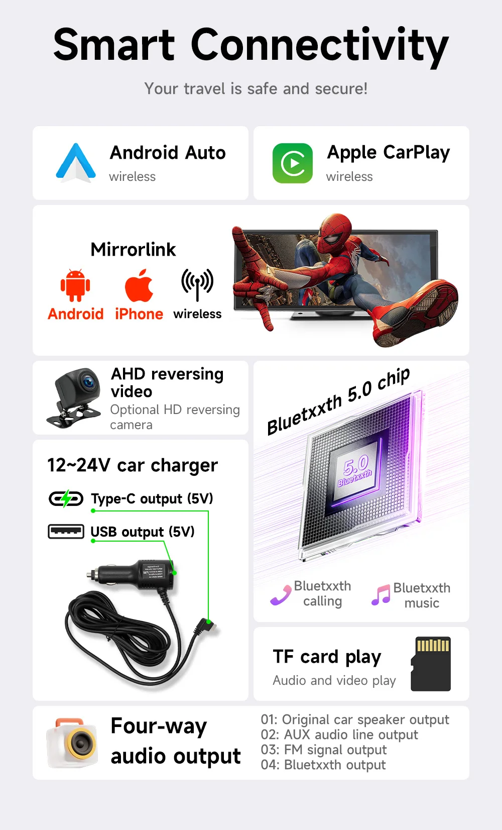 BQCC 11.26" Portable Car Player Transform your car's infotainment with this 11.26" IPS touchscreen supporting wireless CarPlay & Android Auto. Features Bluetooth 5.0, FM transmitter, USB/TF card playback, and AUX output for seamless audio integration. Key Specs: ⦁ 1024x600 resolution, 450 nits brightness ⦁ Android 10 OS with split-screen multitasking ⦁ 12-24V power, 3-minute plug-and-play install ⦁ 360° adjustable mount (suction/adhesive) Performance: 4.8s CarPlay connection, 1080p video, Siri/Google Assistant. Price Now: EUR 97.39 (Original price: EUR 278.26, 65% off) | Rating: 4.7/5 (1,247 reviews) Perfect for: Upgrading older vehicles without permanent modifications. Easy setup, universal fit, excellent value!